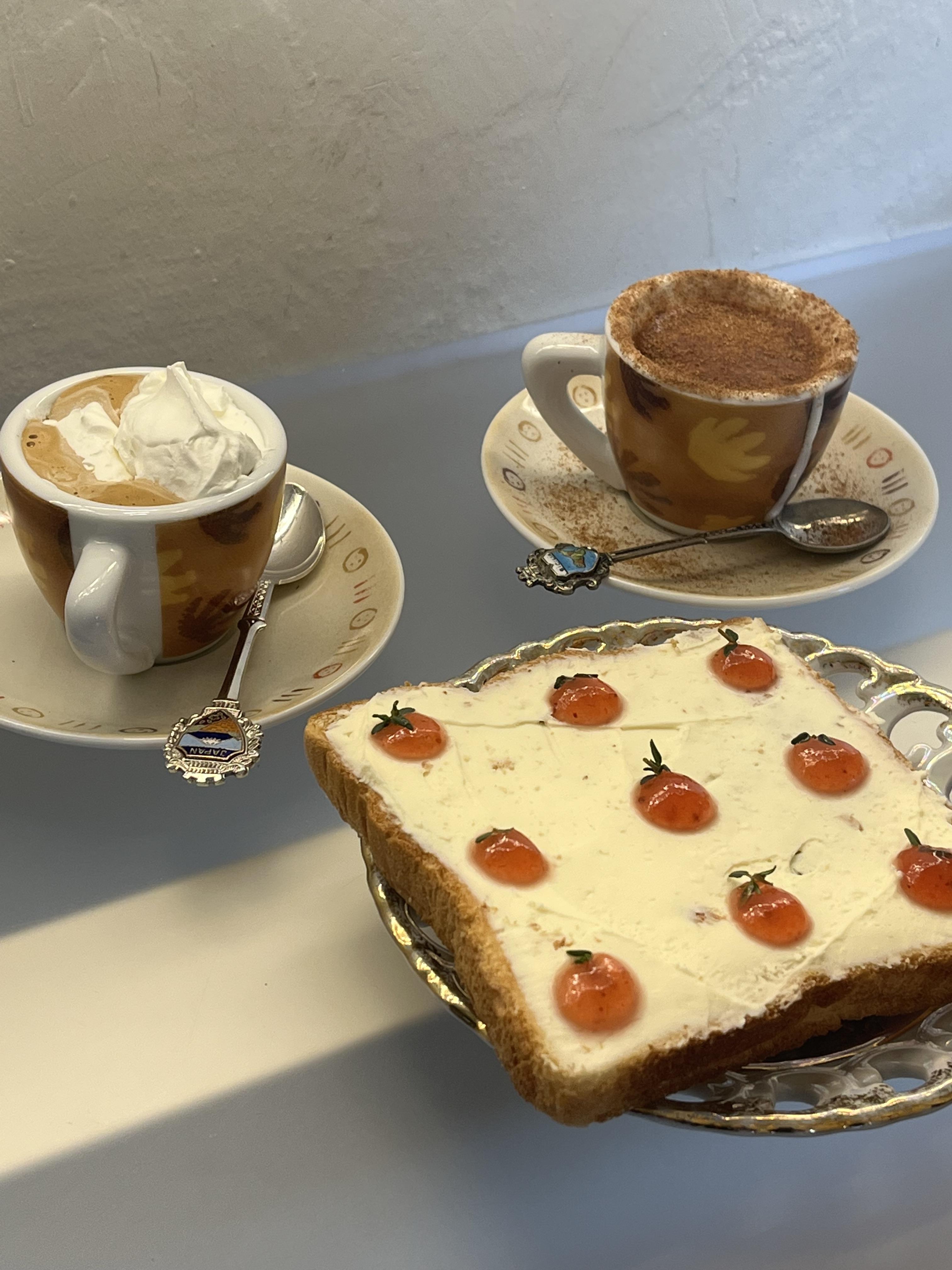 이름처럼 왕귀엽고 왕맛있는 토스트입니다. 젤리처럼 보이는 건 딸기잼같아요. 그리고 위에 꼭지는 허브인 듯 합니다.